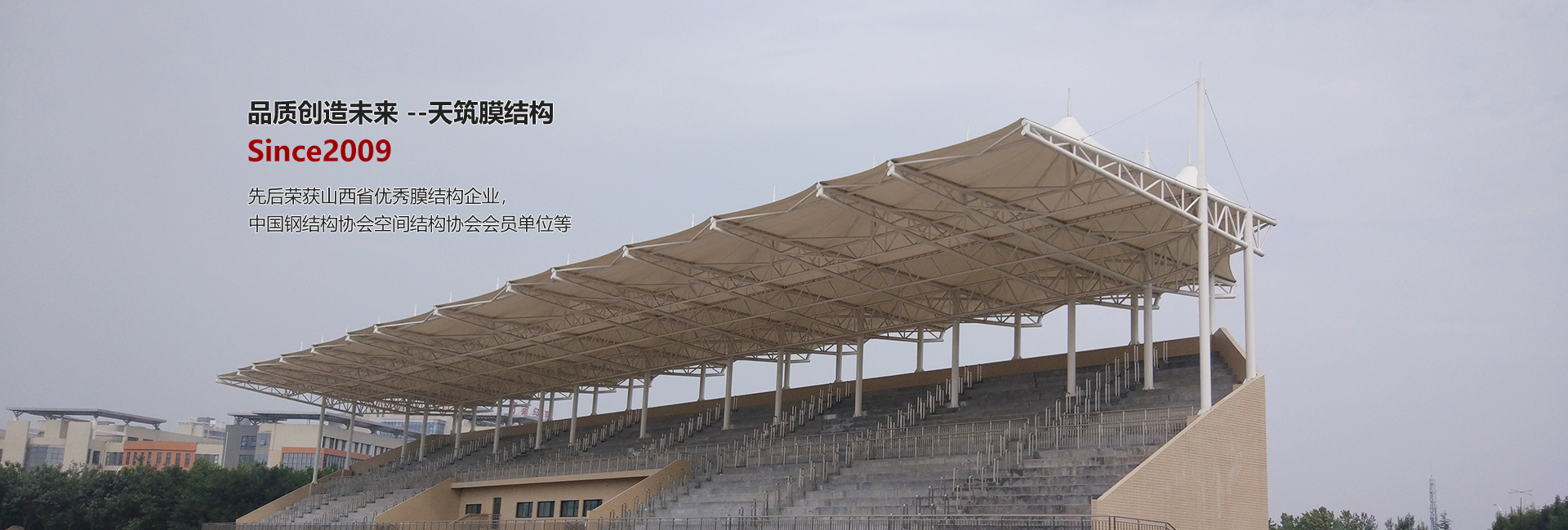 太原天筑膜結構技術有限公司主要從事膜結構工程的方案設計、結構設計、靜動力計算分析、膜材的裁剪設計、膜材的加工制作安裝、鋼構件的設計加工整體安裝及使用維護,集科研開發與制作安裝為一體的科研生產型企業。服務范圍涉及電動車/自行車車棚、汽車停車棚、廣場公園景觀張拉膜、新能源充電樁膜結構雨棚、體育場看臺膜結構、加油站收費站膜結構大棚、表演舞臺膜結構雨棚、廊道遮陽棚、永久性膜結構建筑遮陽棚、污水池膜結構封閉、充氣膜等膜結構工程的設計、制作加工安裝、售后維修服務。公司立足太原,輻射華北、華中地區數十省,是華北地區專業性、規模型的膜結構工程企業之一。公司成立以來,組織承建了520余項近36萬平方米的膜結構工程……
